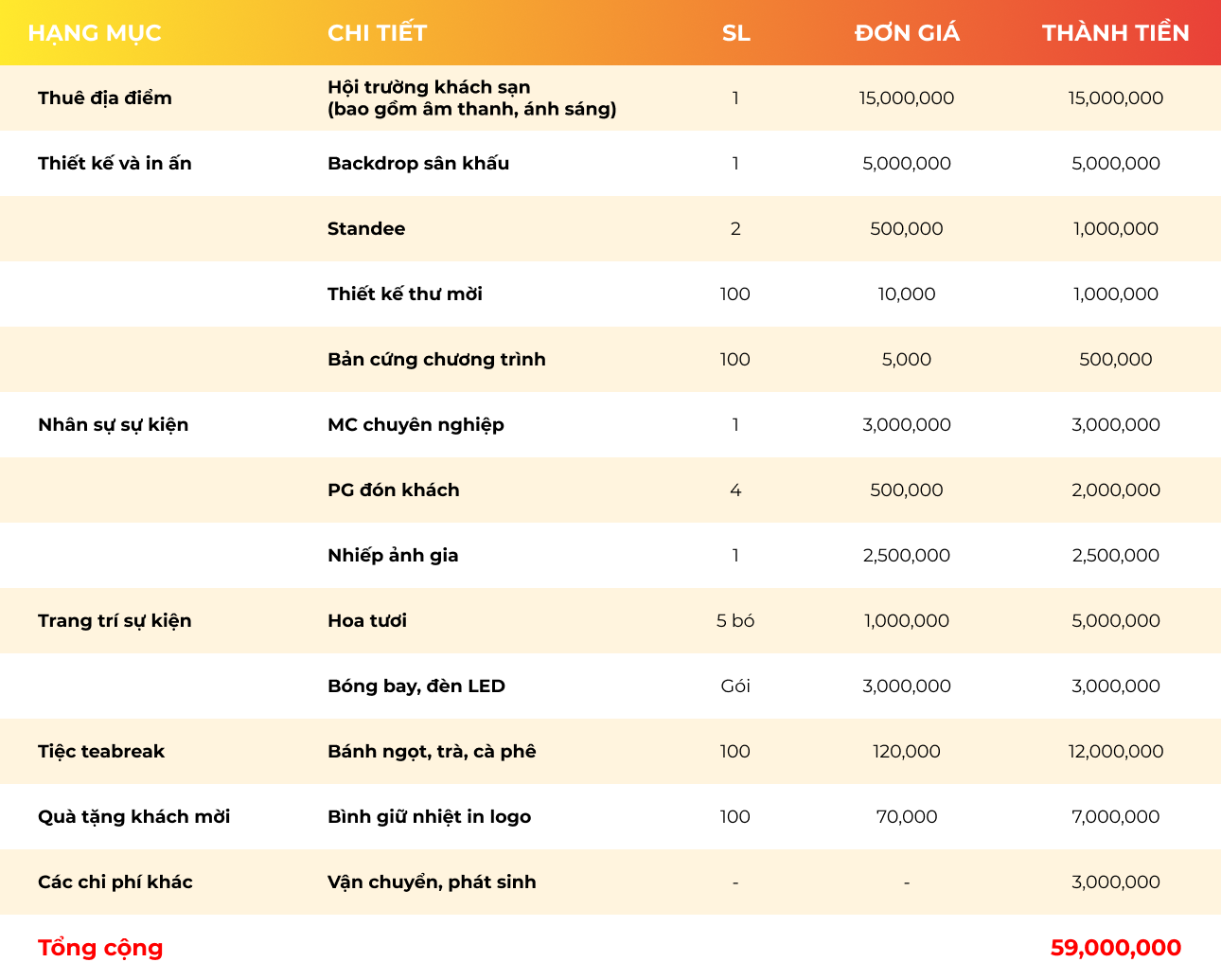 CHI PHÍ TỔ CHỨC SỰ KIỆN THÀNH LẬP CÔNG TY TRỌN GÓI