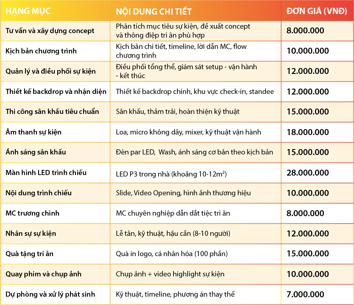 Tuỳ quy mô và tính chất sự kiện, bạn cần dự trù thêm chi phí cho tiệc, Teabreak, tiết mục giải trí…Chúng tôi tại LCT Communication luôn lắng nghe, phân tích nhu cầu và ngân sách của khách hàng để tư vấn gói dịch vụ phù hợp nhất.